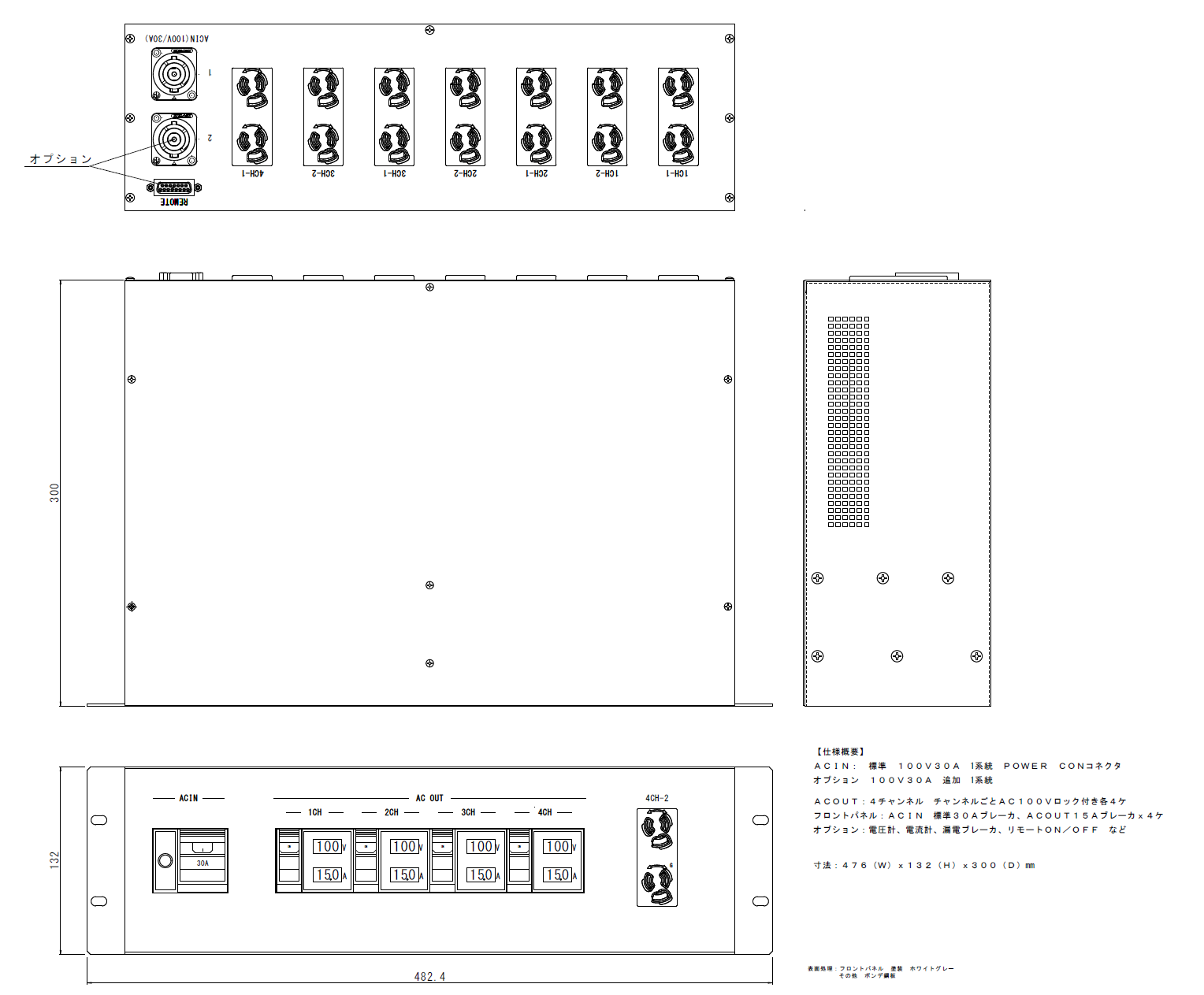 - 標準品で3U筐体に入力30Ax2入力、出力15Ax4出力(抜け止めACコンセント3Px4系統)